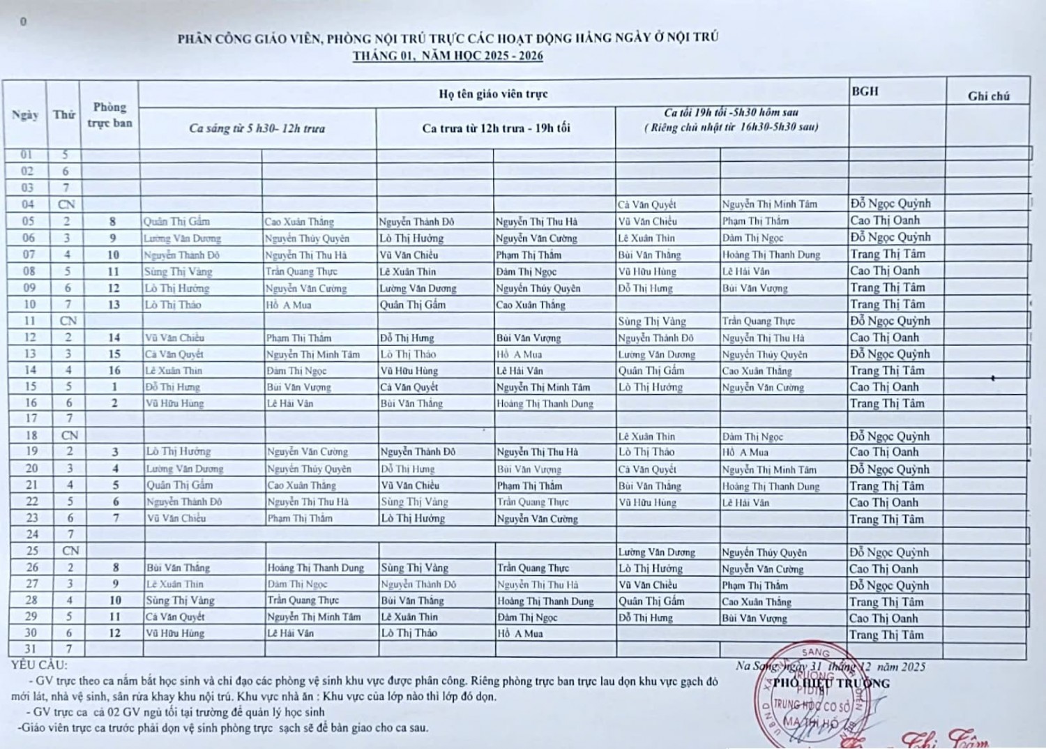 Bảng phân công giáo viên trực các hoạt động hàng ngày ở nội trú tháng 1 năm học 2025-2026