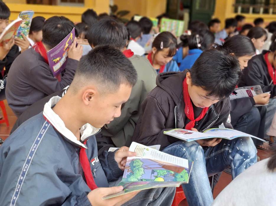 Các em học sinh trường PTDTBT THCS Ma Thì Hồ hô hức tìm hiểu kiến thức thông qua sách lưu động.